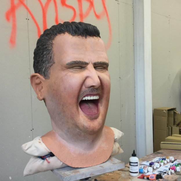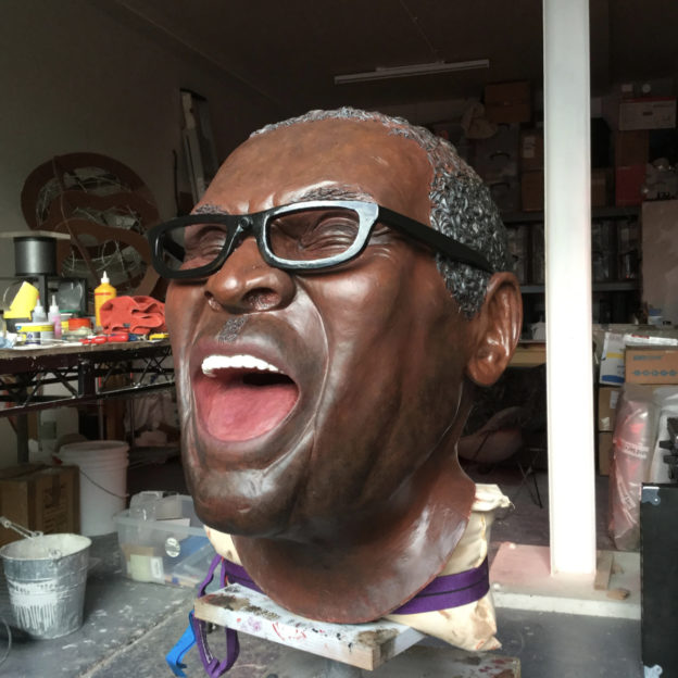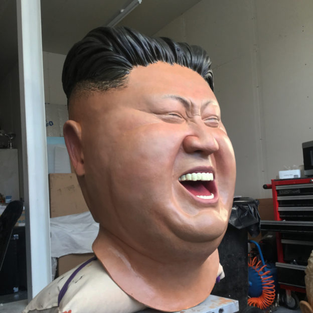 2016. Fibreglass and acrylic paint, with integrated video guidance system, battery powered PA and looped laughter track. 65 x 36 x 36cm.